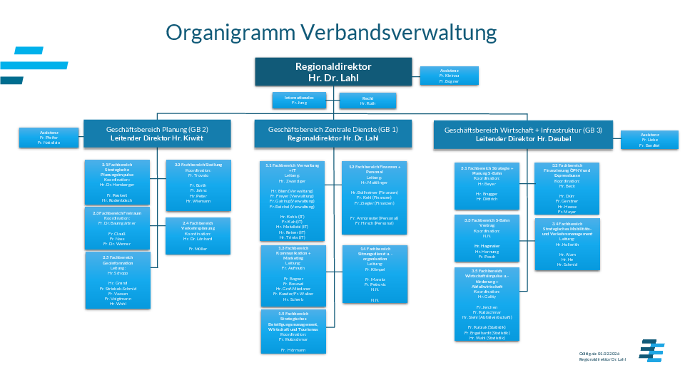 Die Entscheidungen in der Regionalversammlung und in ihren drei Ausschüssen verlaufen einfach: Diskussion, Abstimmung, nächster Punkt. Doch hinter diesen Abläufen stehen nicht selten monatelange detailgetreue Vor- und Nachbereitung, Abwägungen und Recherche, um die Grundlagen für wichtige Entscheidungen zu schaffen. Diese werden vom rund 80-köpfigen Team der Verbandsgeschäftsstelle in der Kronenstraße interdisziplinär, zielorientiert und flexibel für die Region erarbeitet. Zusätzlich stecken hinter den Bereichen Planung, Wirtschaft und Verkehr unzählige Aufgaben und Projekte, die die Menschen der Region mal direkt, mal indirekt betreffen und deren sorgfältige Vorbereitung unerlässlich für die Entscheidungsfindung auf politischer Ebene ist. Ebenso wie die Vorbereitung beruht auch die anschließende Umsetzung auf der sorgfältigen Arbeit in der Verbandsgeschäftsstelle und auf der engen Zusammenarbeit mit Kommunen und Partnerinnen und Partnern im In- und Ausland.