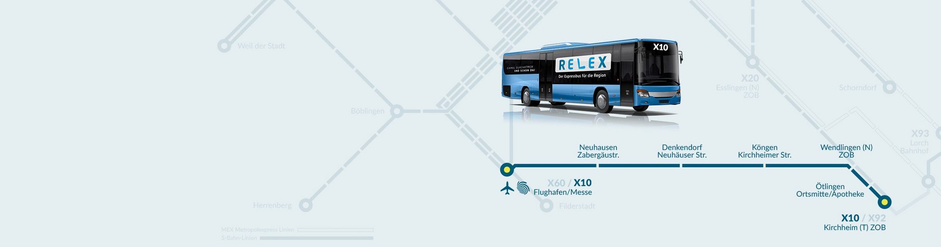 The RELEX express bus X10 creates an important cross-connection between Kirchheim unter Teck and Stuttgart Airport/Messe. It thus supplements the S-Bahn network in places where there was previously no direct connection. Fast, with few intermediate stops and so relaxed and comfortable that nothing can upset you: That is the RELEX effect.
